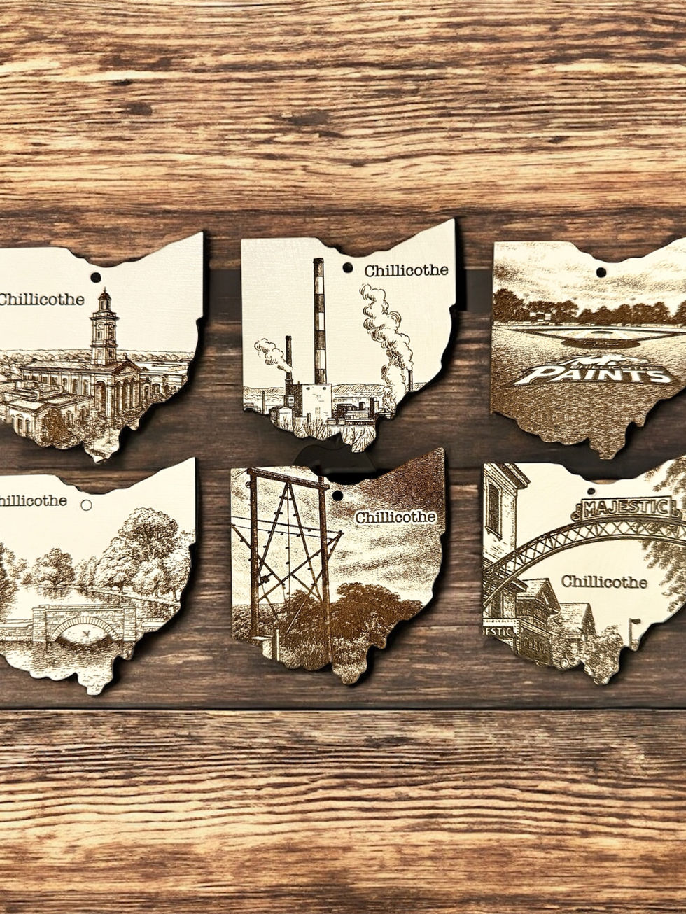 Celebrate Chillicothe with these beautifully engraved Ohio-shaped wooden ornaments, each featuring a detailed sketch of one of the city’s most beloved landmarks. Whether you’re local, gifting to someone who grew up here, or simply love collecting hometown pieces, these ornaments make a meaningful addition to any Christmas tree.