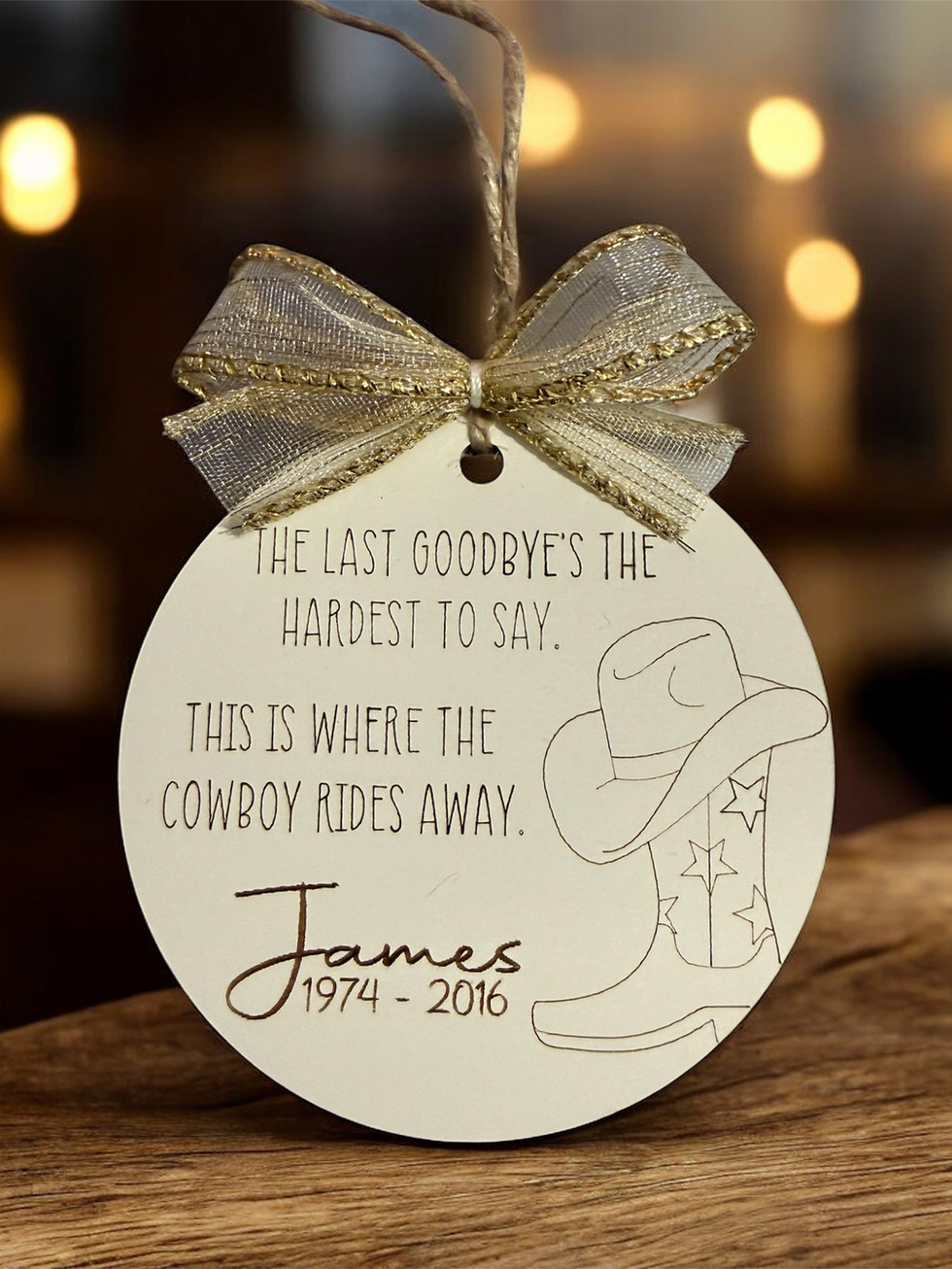 A touching tribute for those who’ve ridden ahead but remain forever close to heart. This handcrafted wooden ornament features a cowboy hat and boot design with the engraved phrase: